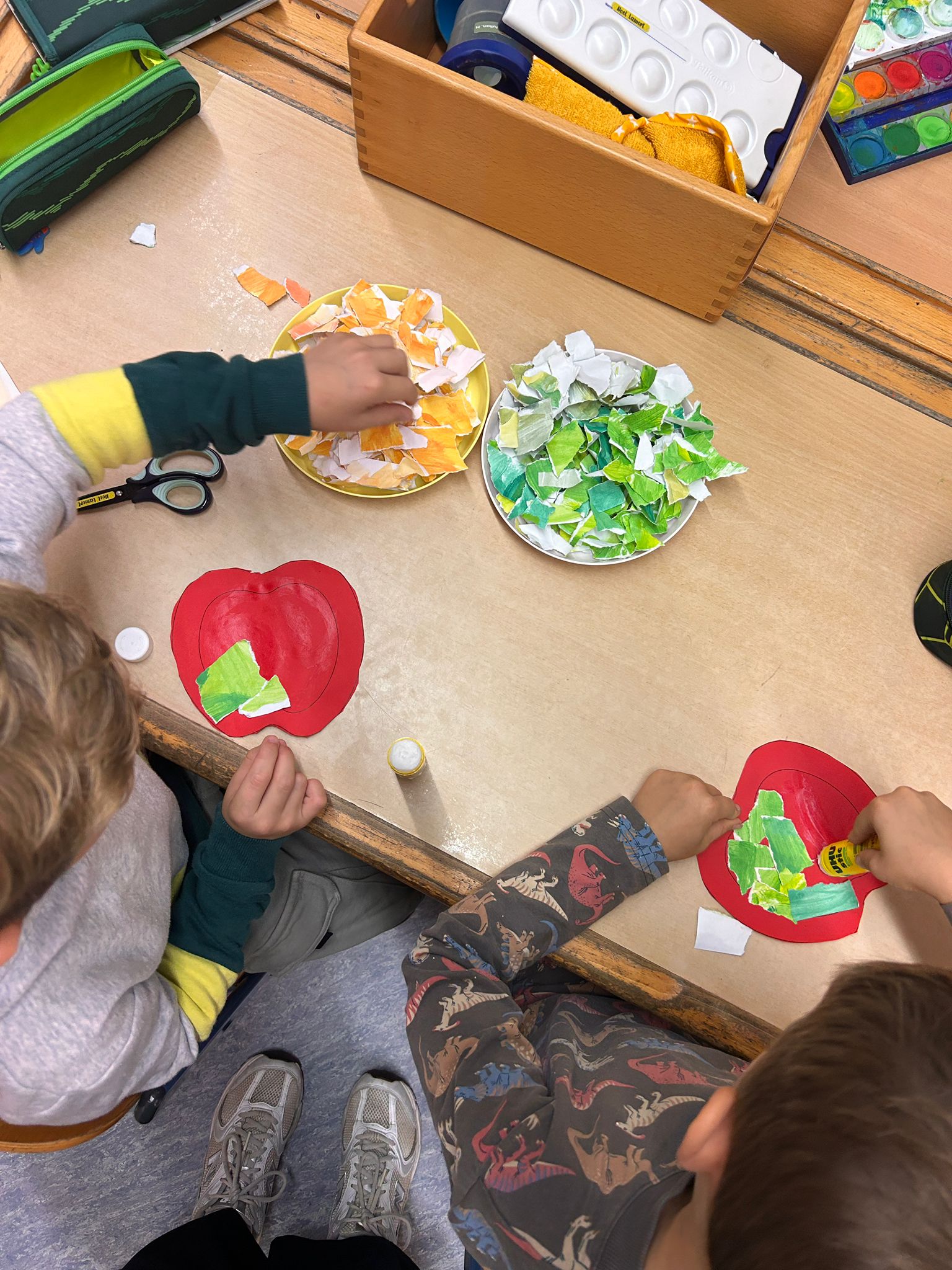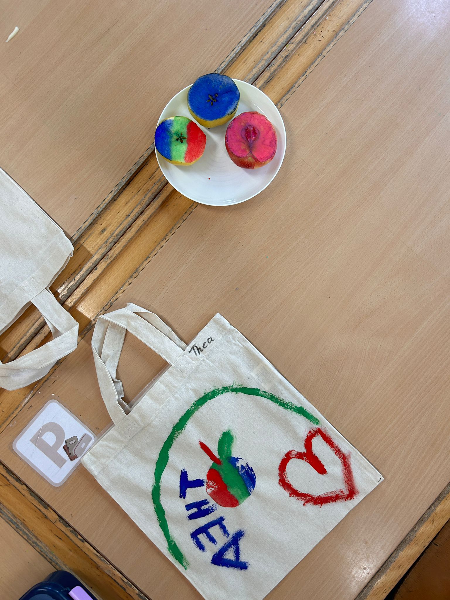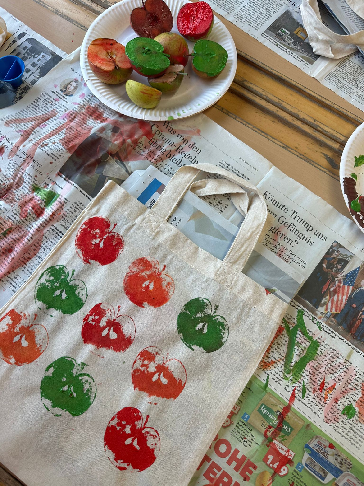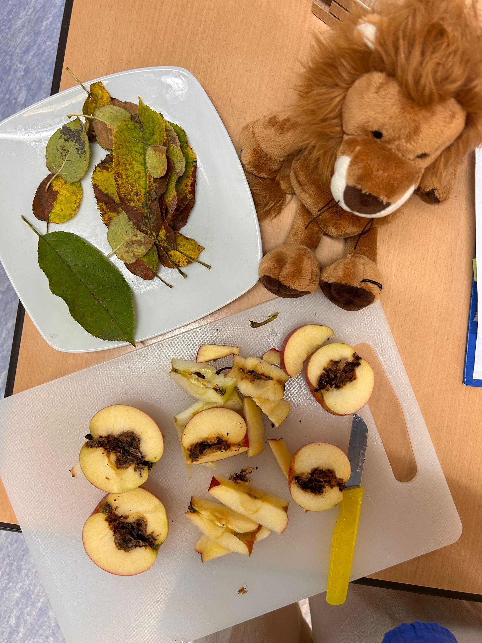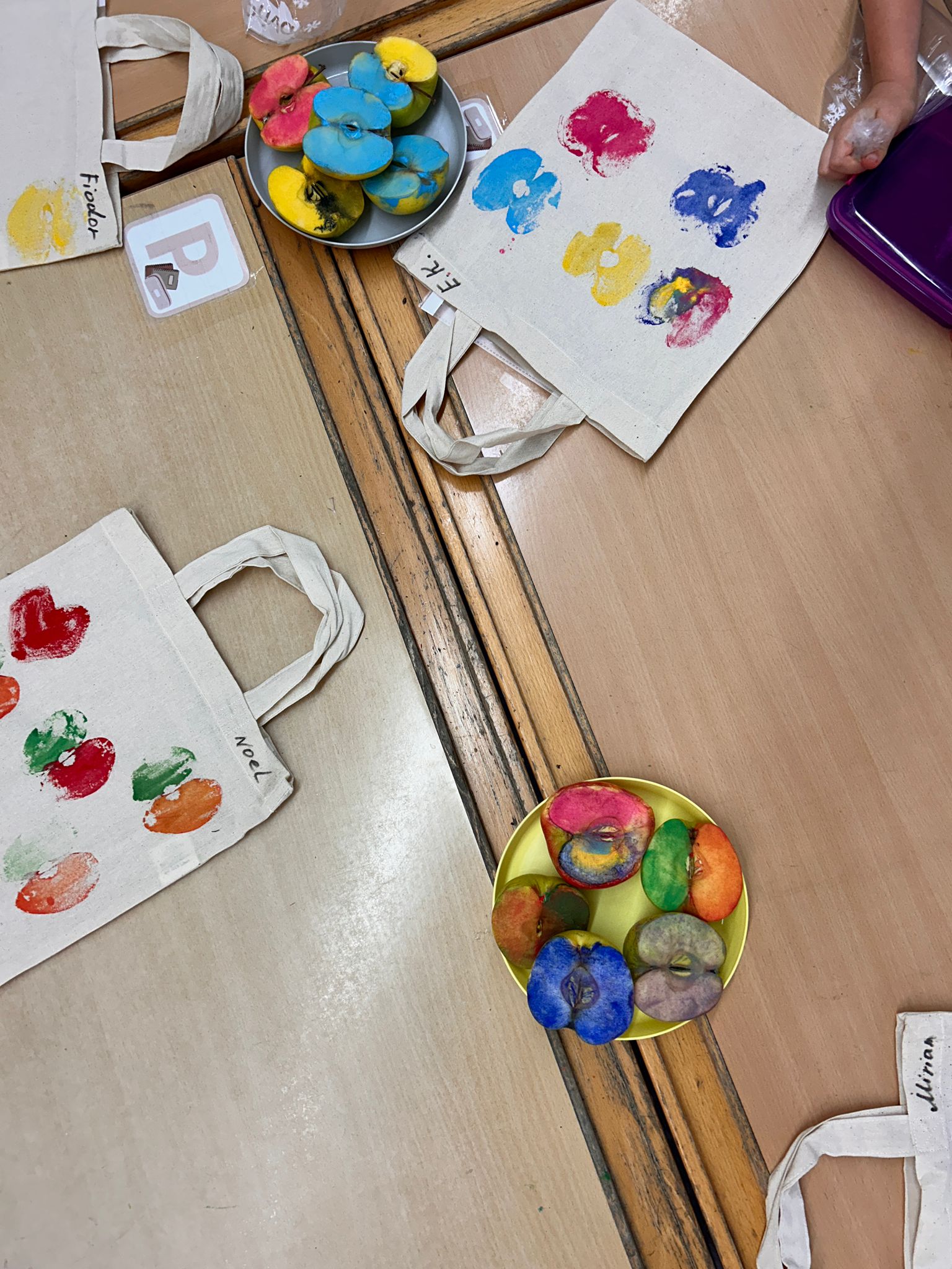 Der erste Jahrgang beschäftigte sich sowohl kreativ und erforschend rund um den Apfel. Angefangen mit einer Verkostung verschiedener Apfelsorten stiegen die Schülerinnen und Schüler multisensorisch in das Thema ein. Im Schulgarten wurde der schuleigenen Apfelbaum betrachtet und sogar einige Früchte geerntet und probiert. Der Querschnitt des Apfels sowie das Blatt eines Apfelbaums konnte genau untersucht werden. Auch künstlerisch wurde der Apfel in seiner ganzen Vielfalt dargestellt. Die Kinder bastelten Apfel-Girlanden, Apfel-Fensterbilder und verzierten kleine Jutebeutel mit dem Apfeldruck.